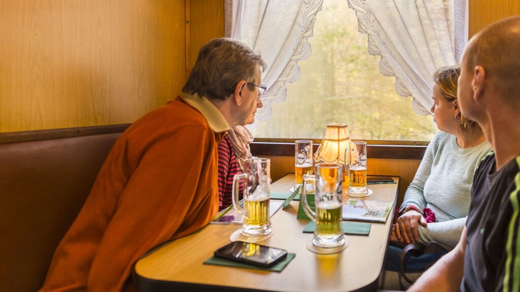 In den nostalgischen Wagen der Weißeritztalbahn sitzt man wie zu Kaisers Zeiten. Auf kleinen aber bequemen Lederbänken im holzgetäfelten Passagierwagon fliegt durch handgestrickte Vorhänge scheinend die wunderschöne Landschaft des Weißeritztals vorbei. Fast mahnt das wachsame Auge der schnellen Fahrgeschwindigkeit, wenn da nicht der wohlschmeckende Gerstensaft wäre. Dieser wird auf der erlebnisreichen Fahrt von Freital nach Dippoldiswalde durch einen hausgemachten Bierkenner spannend anmoderiert. Natürlich darfst Du während dieser fahrenden Bierverkostung auch Deinen Durst löschen. Dass Sachsen und die Bierbrauerkunst seit je her eng befreundet sind, wird einem bei diesem Erlebnis aufs Schönste nähergebracht. Denn dieses Erlebnis hält auf Deiner unterhaltsamen Fahrt durch das Weißeritztal gleich drei köstlich-schmeckende Bierspezialitäten bereit. Der abgesandte Vertreter des königlichen Getränkes „Braumeister Michael“ weiß aber nicht nur durch sein fundiertes Bierwissen zu beeindrucken, auch spannende Geschichten und Anekdoten zur Region, dem Weißeritztal und zu der vor ihm schnaufenden Dampflok erzählt er gern.