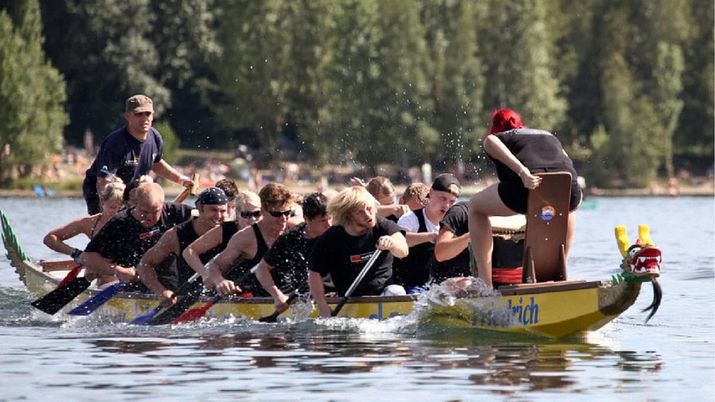 Drachenboot fahren ist ein Teamsport bei dem eine Gruppe von Personen in einem langen, schmalen Boot paddelt. Der Takt wird von einem Trommler an der Vorderseite des Bootes vorgegeben.