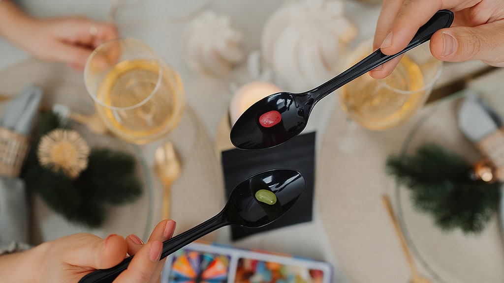 Entdecke unsere Geschenkbox für Dinner in the Dark Gutscheine und bestelle Dir Dein Rundum-Sorglos-Paket dazu. Unsere Geschenkbox für die Dinner in the Dark Erlebnisse ist als ein Spiel konzipiert. Überrasche Deine Liebsten mit der Box und lass sie einfach die von uns kreierten Kostproben probieren. Dafür haben wir extra Schlafmasken mit dazu gepackt. Diese bitte unbedingt vorab dem Beschenkten überstreifen und dann unsere Kleinigkeiten auf die Löffel verteilen. Wer schafft es alle sechs Zutaten richtig zu erschmecken?