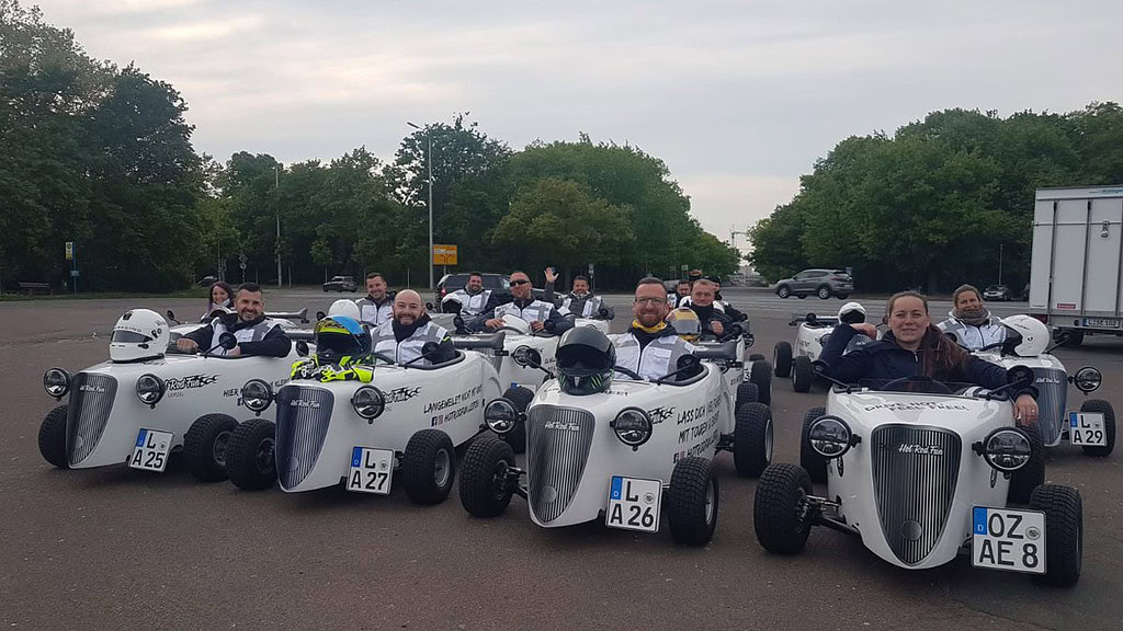 Zu Beginn der Tour erhält jeder Teilnehmer eine ausführliche Einweisung in den Umgang mit den kleinen HotRods, welche für die nächsten zwei Stunden das neue Gefährt sein werden. Dabei steht Sicherheit an oberster Stelle, daher wird jedem Fahrer auch ein Leihhelm sowie ein Sturmhaube zur Verfügung gestellt. Ist dann der Umgang mit den kleinen Hot Rods geübt, geht es auch schon los. Da die Voraussetzung zur Teilnahme der Besitz eines gültigen Führerscheins der Klasse 3 / B darstellt, ist der Umgang mit den Autos auch für die wenigstens ein Problem. Lediglich lenken, Gas geben und bremsen. Mehr muss man gar nicht können. Die kleinen Flitzer können aber durchaus auch schnell auf den Straßen in Leipzig unterwegs sein. In der Spitze schafft ein Hot Rod stolze 88 km/h – doch natürlich werden alle Teilnehmer während der Tour sich an die jeweiligen Geschwindigkeitsbegrenzungen halten. Der Guide, welcher vorweg fährt, gibt auch keine andere als die zulässige Geschwindigkeit vor.