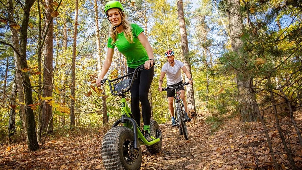 Ein Monsterroller ist im Grunde ein Tretroller. Das heißt, es ist durchaus Beinarbeit erforderlich. Ein Monsterroller ist ein Sportgerät aus dem Bereich des Fun- und Extremsports und verfügt über mechanische Scheibenbremsen. Die großen und breiten Räder zeichnen unterscheiden ihn schon direkt von einem normalen Roller. Ein Monsterroller ist für das unwegsame Gelände gemacht. Der Lenker erinnert an ein Fahrrad, sodass die Kurven sicher und einfach genommen werden. Zumeist führt der Weg auch abwärts, sodass man nicht stetig zur Fortbewegung treten muss.