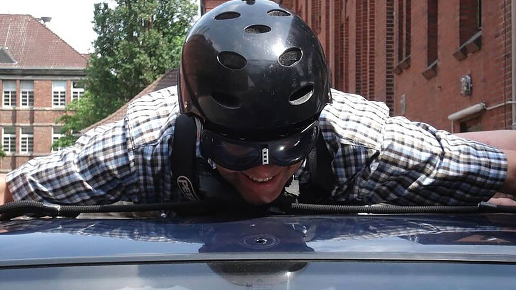 Ein behelmter Stuntman probt eine Szene auf dem Dach eines Autos